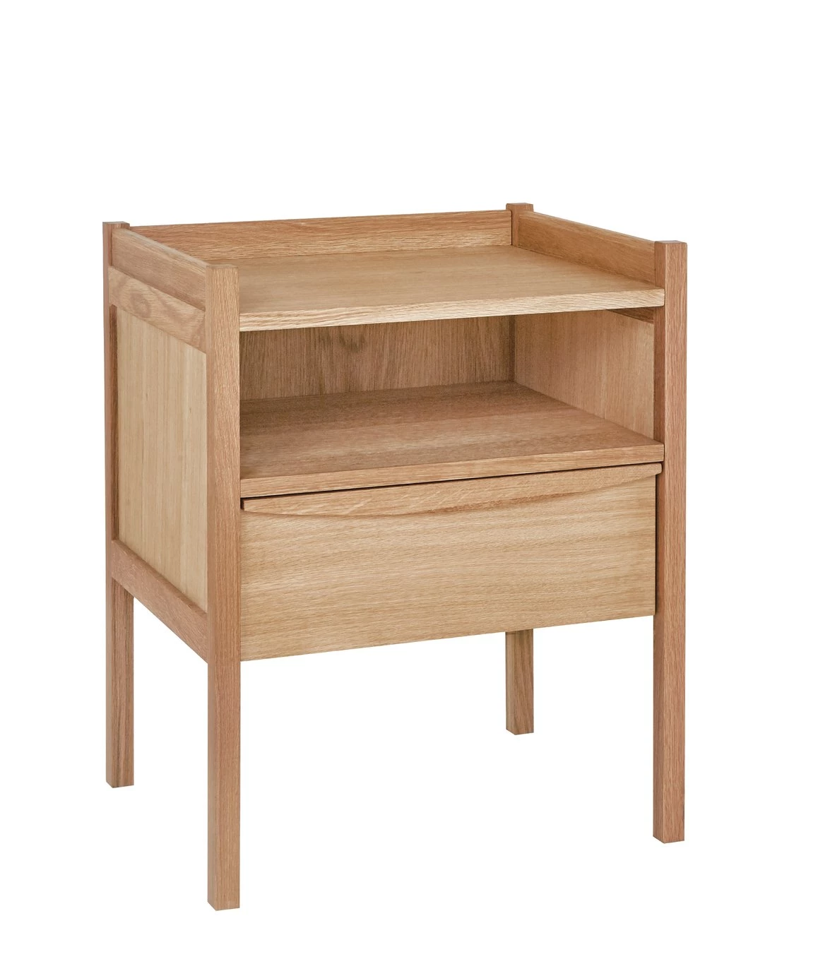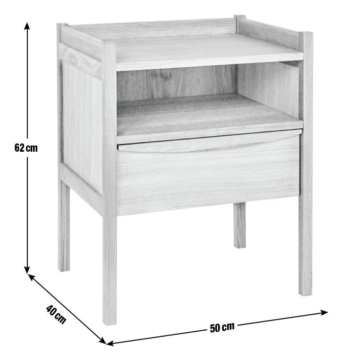 Inspired by mid-century design, the Derwent oak 1 drawer bedside table with shelf offers plenty of storage space for your accessories. Crafted from solid oiled oak and oak veneer, the drawer features a hidden groove and slides on metal runners for a smooth finish. Raised on slim legs that give lightness to the piece, the conveniently placed shelf is perfect for storing books, glasses and magazines.