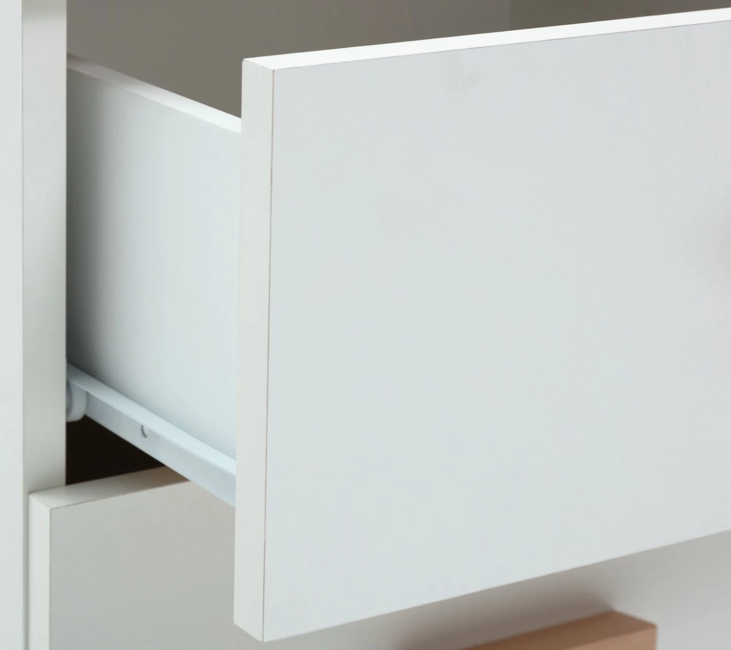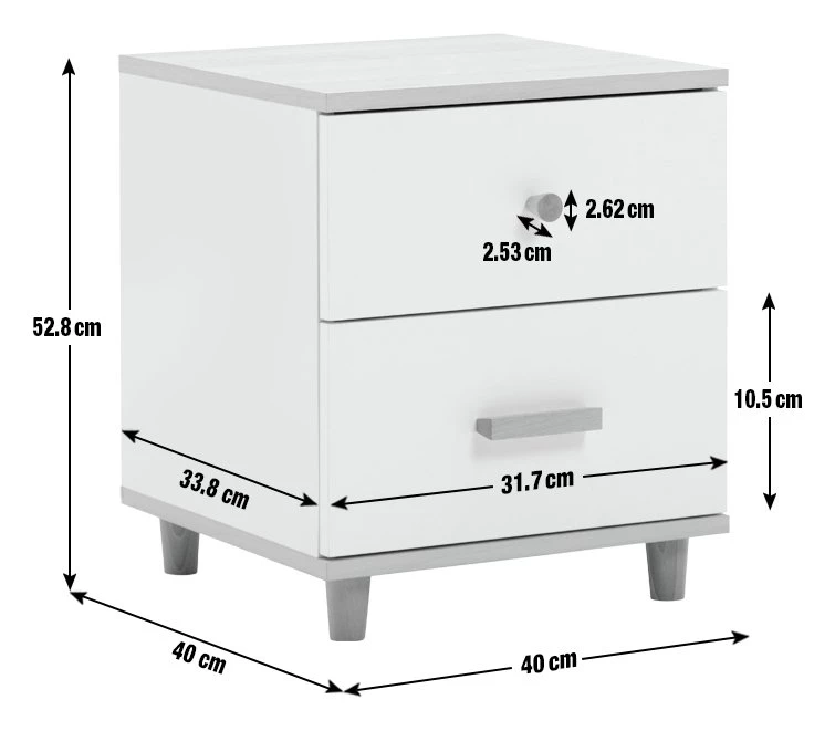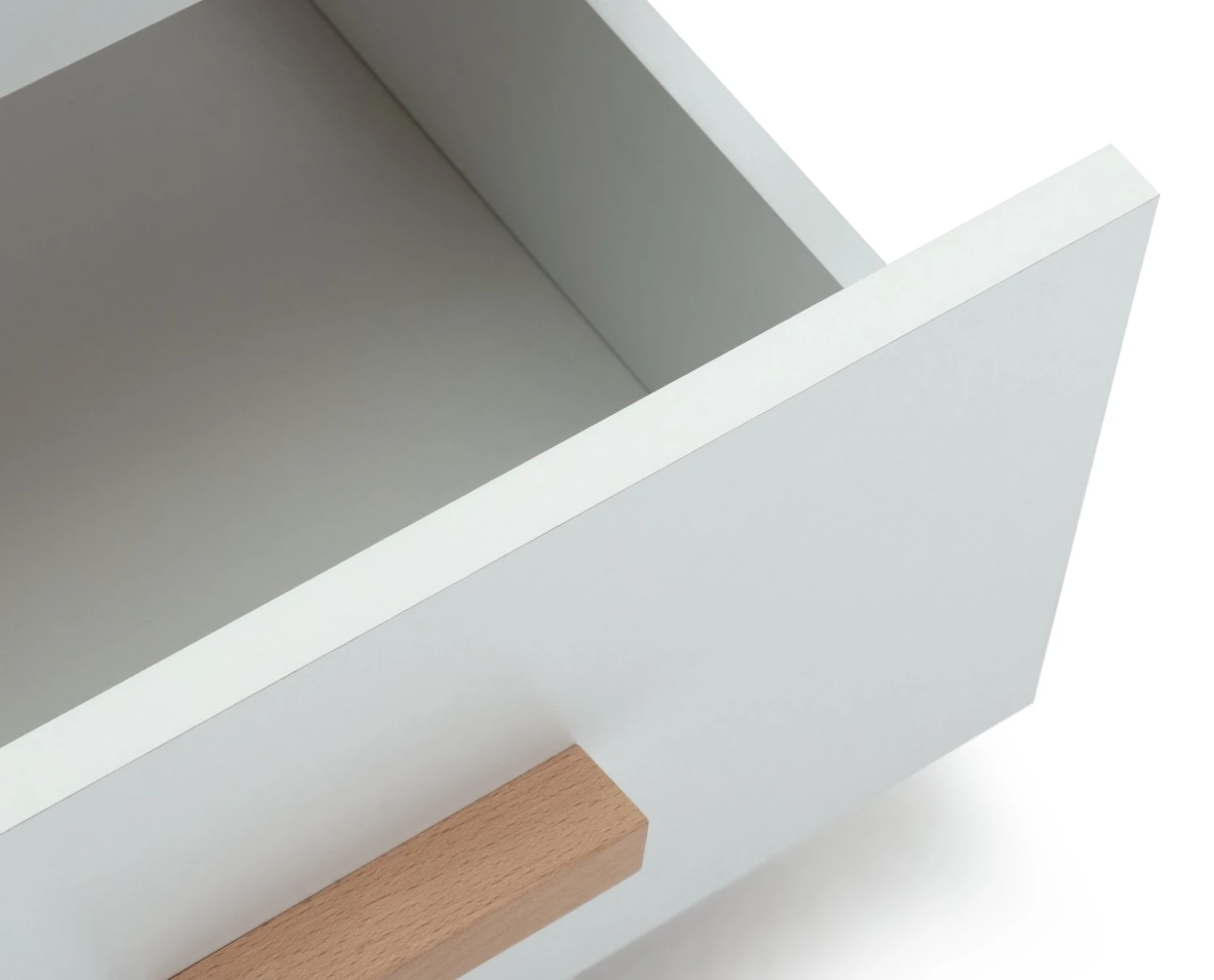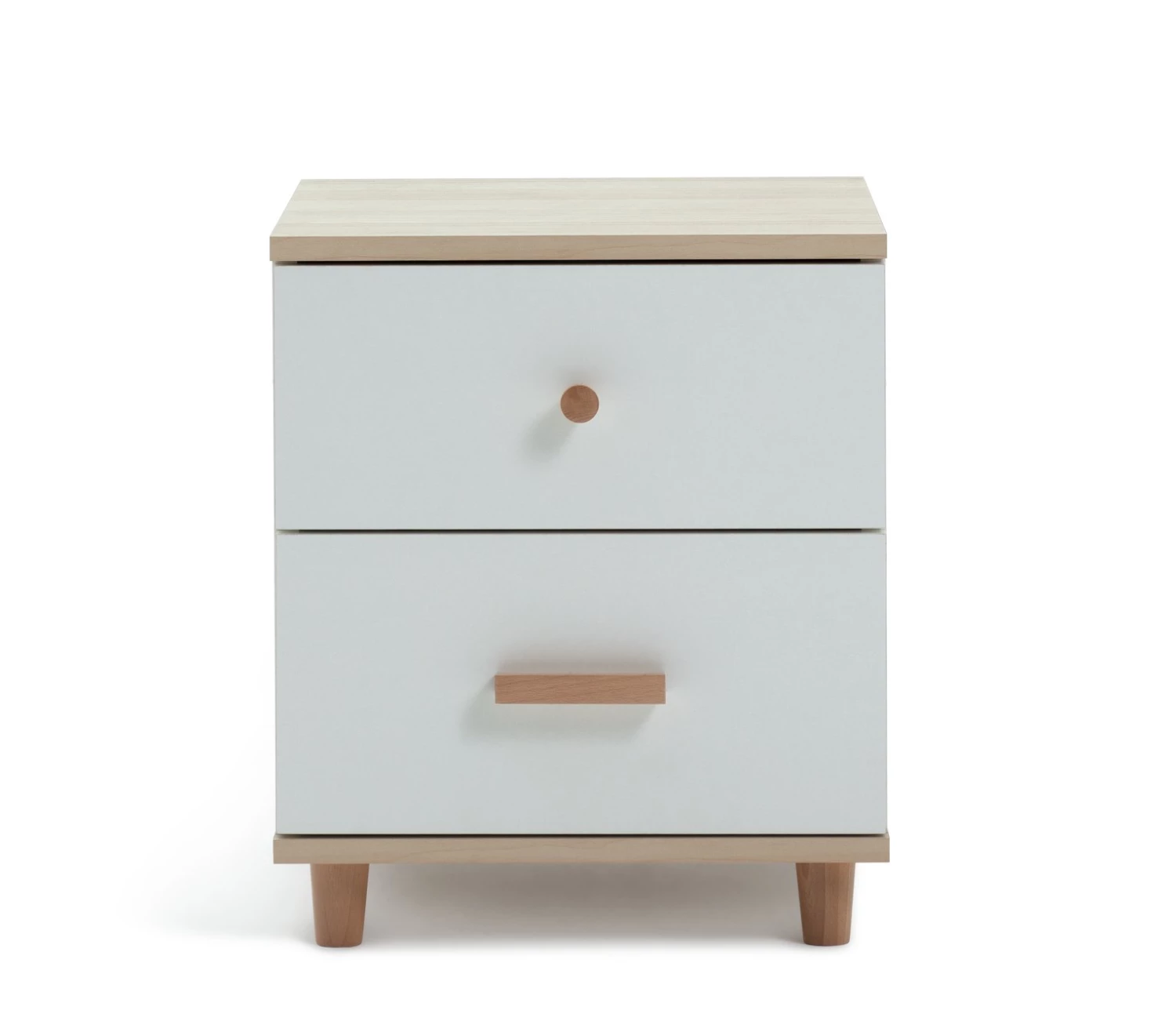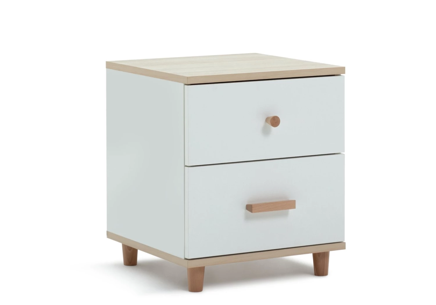 Stow it Skandi style. Our white and wood bedside table is clean and quirky. With different handle styles it is a cheeky cabinet with a fun twist. Your youngster will love to tuck away their games and stationery in the 2 spacious drawers. All within easy reach. Pop a bedside lamp and a pile of books on top. That's story time sorted. Made from FSC wood, it's eco-friendly too. Win-win.