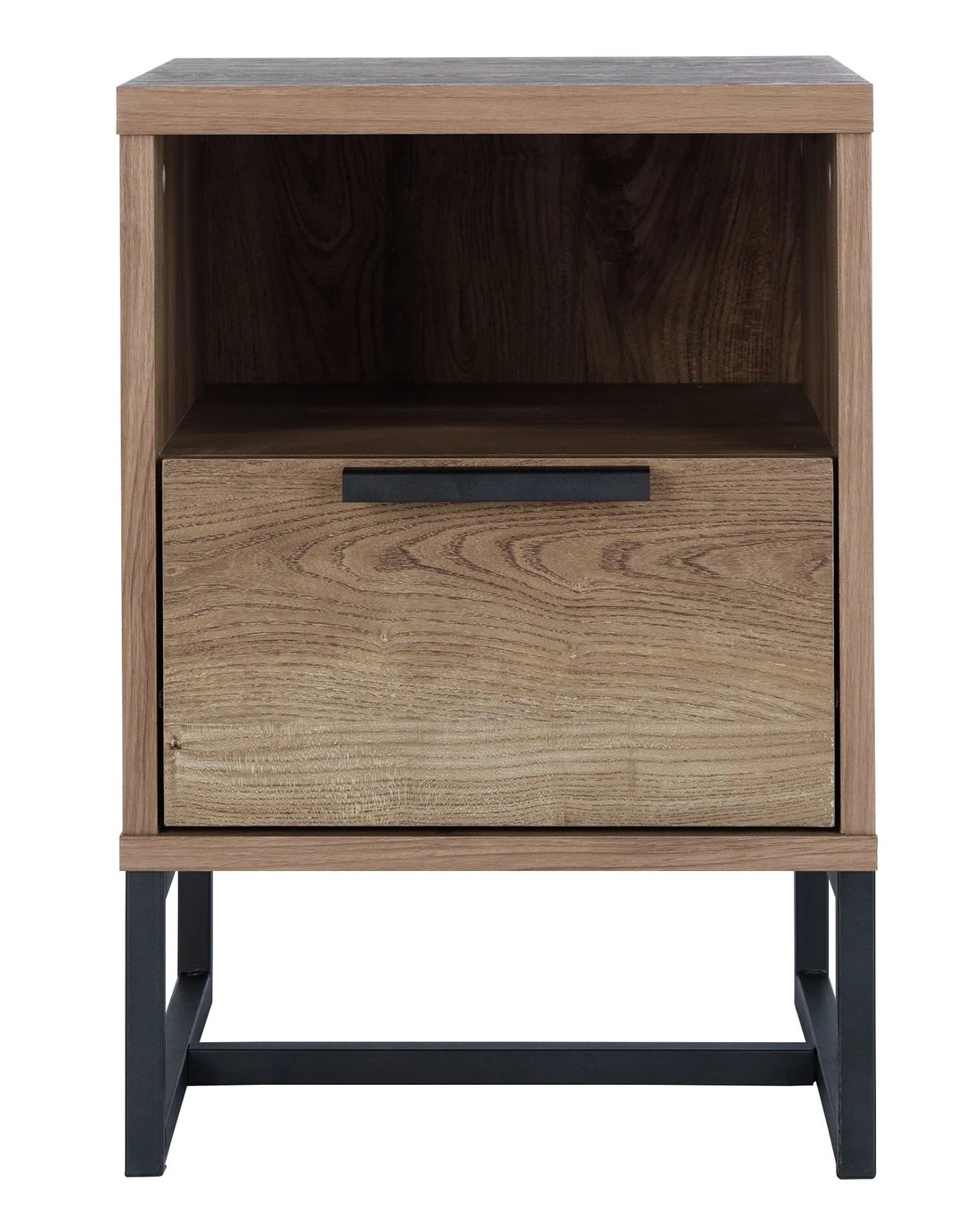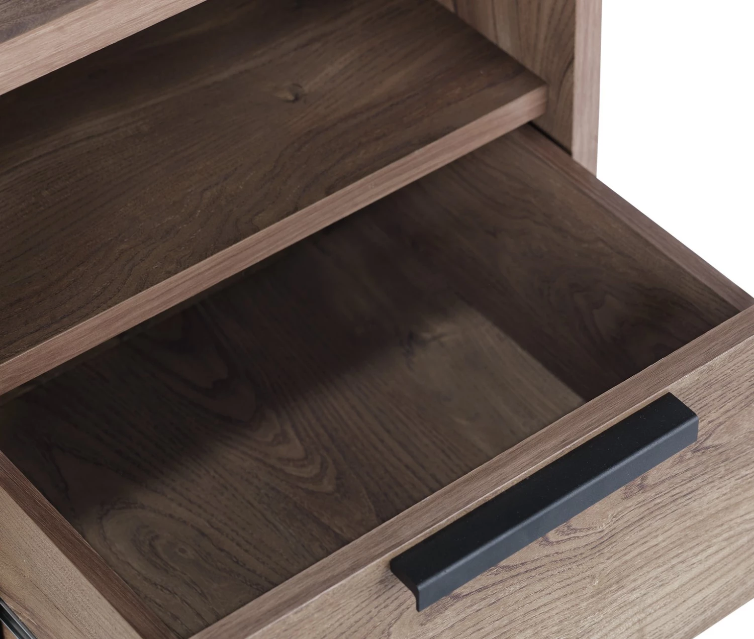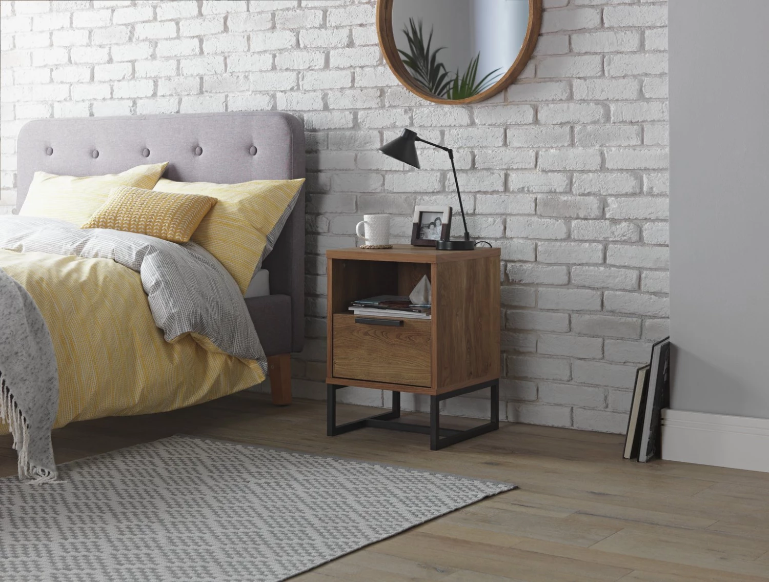Our bedside table is inspired by authentic industrial heritage with metal accents and an oak-effect finish. A deep drawer and cubby hole provide plenty of space for night time essentials and reading materials all wrapped up in one cool, modern look. The handles are dark metal for that industrial edge and the drawer opens easily on smooth metal runners. Add a metal angle poise lamp and maybe a plant to finish off the look.