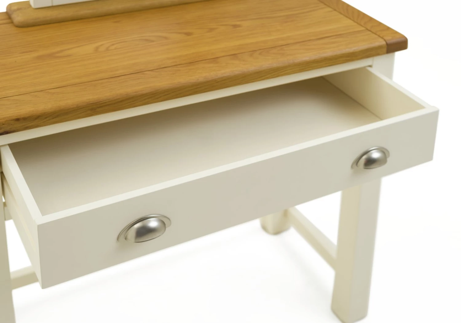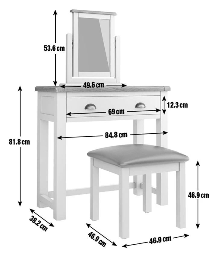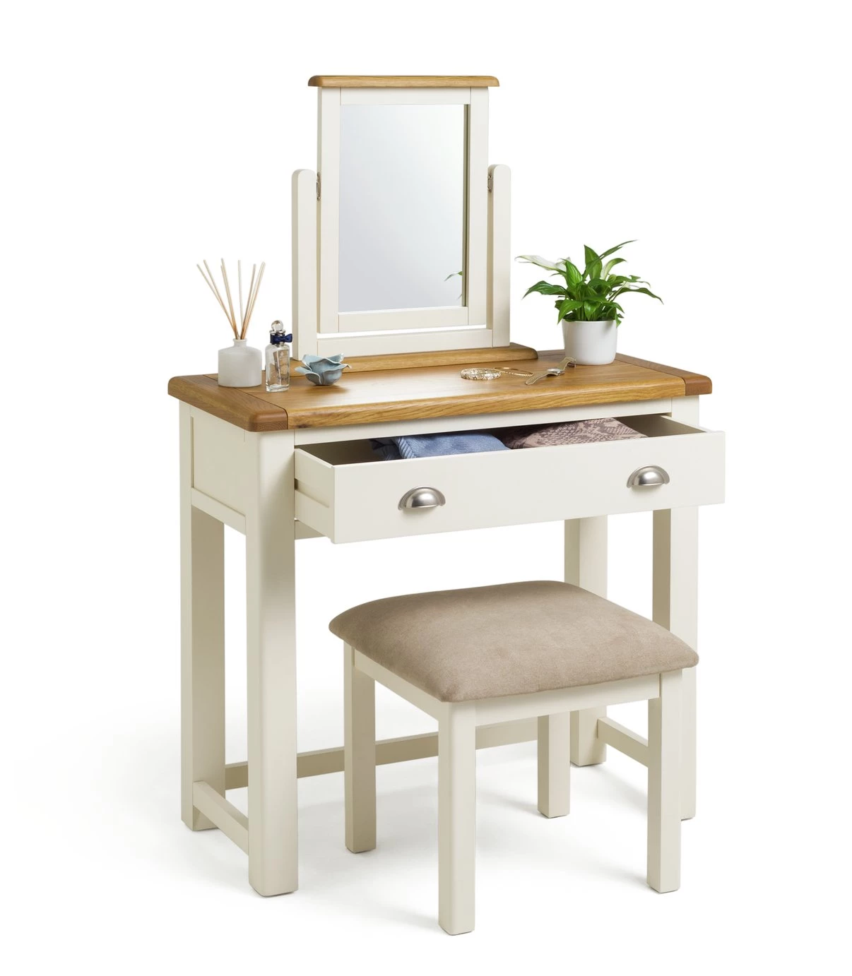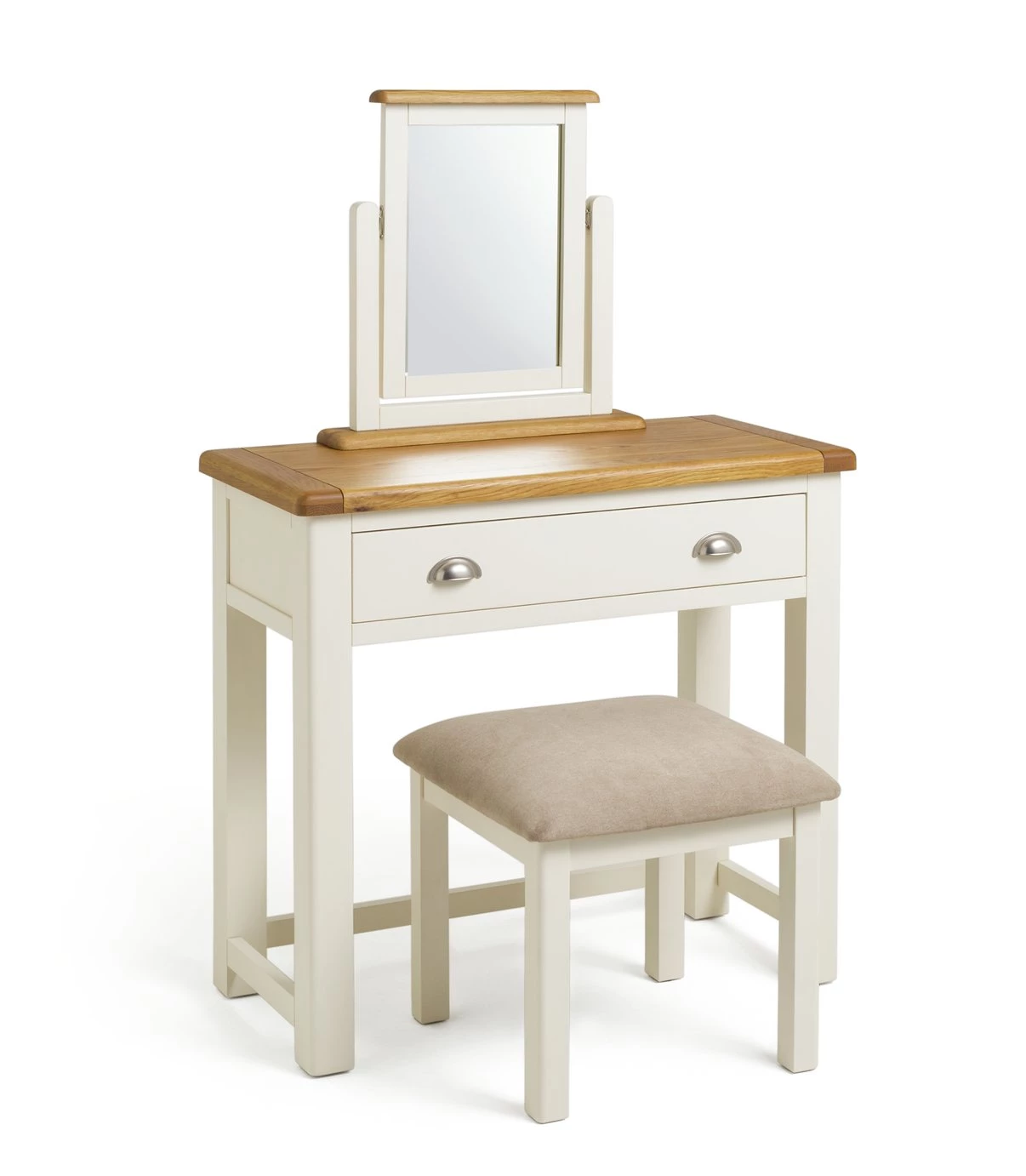 Makeover your make-up station. Achieve instant transformation with our stunning Kent dressing table with stool. A matching oak set with beautiful veneers. Fab. Topped with a swing mirror so you can check your appearance from every angle, and with a pull-out drawer for jewellery, make-up and other accessories – all within easy reach. Our comfy padded stool is as comfortable as it is stylish. Tucks right underneath too. Great for neat freaks.