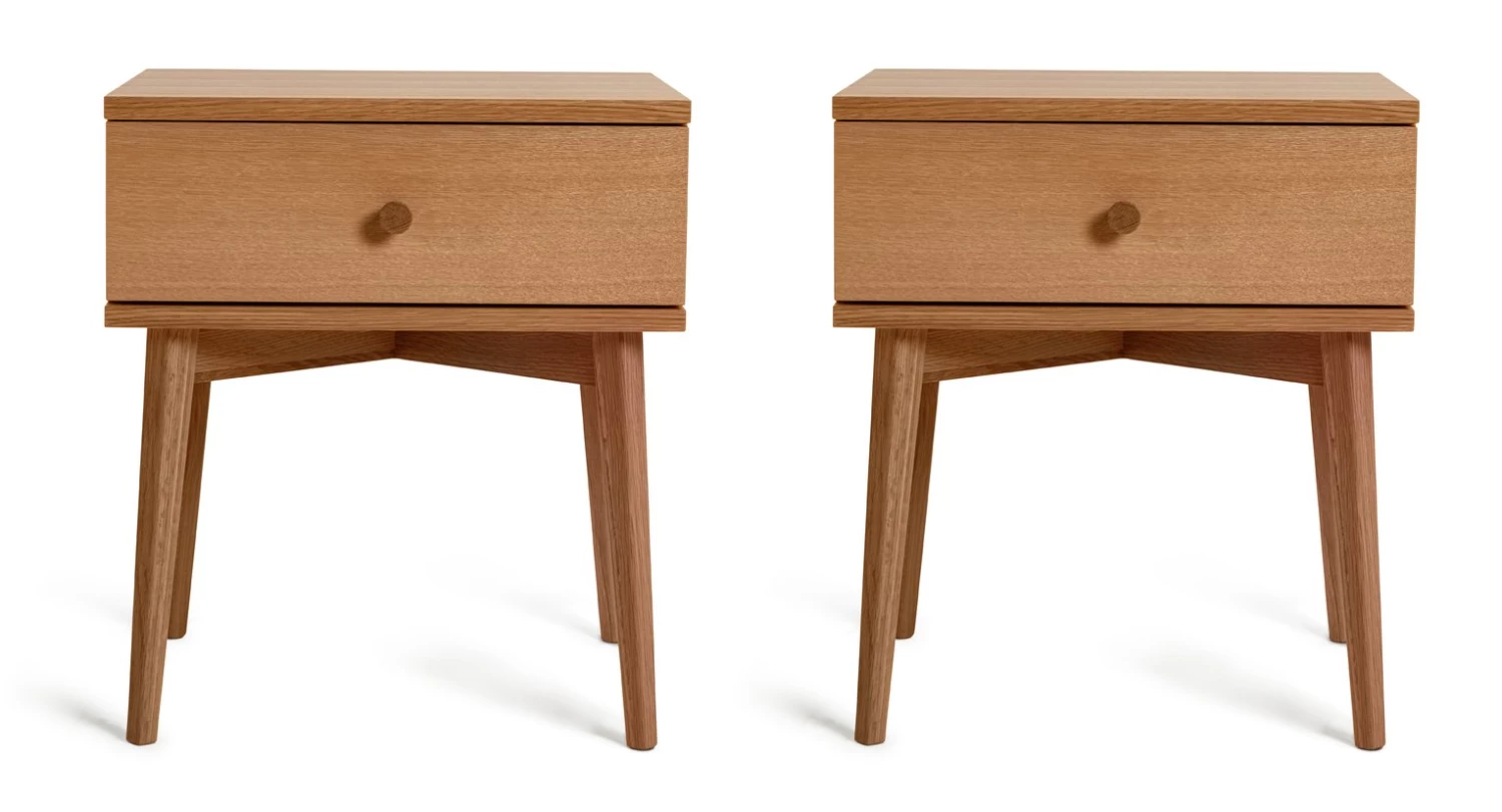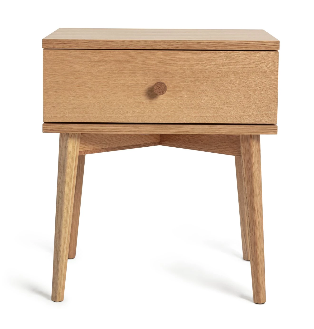A side of modern style please. Breathe new life into your bedroom with our set of 2 bedside tables. The oak veneered nightstands are subtle and stylish with matching knobs and smooth tapered legs. A single drawer glides open on a metal runner with enough space for your electronic devices and bedside essentials. Perfectly practical.
