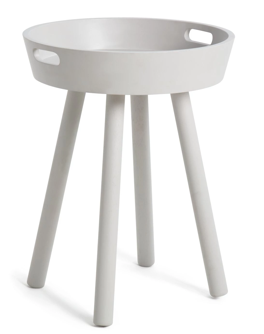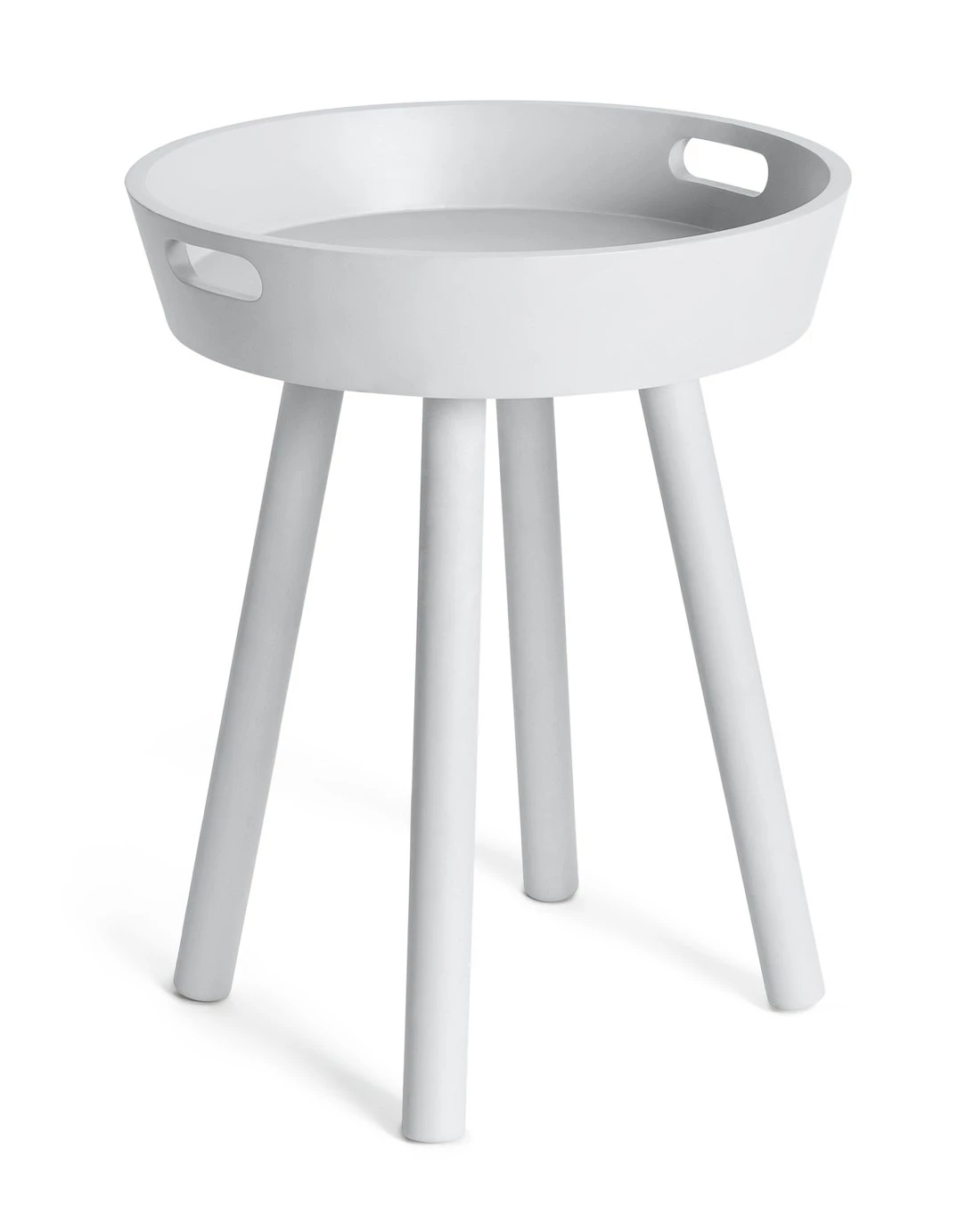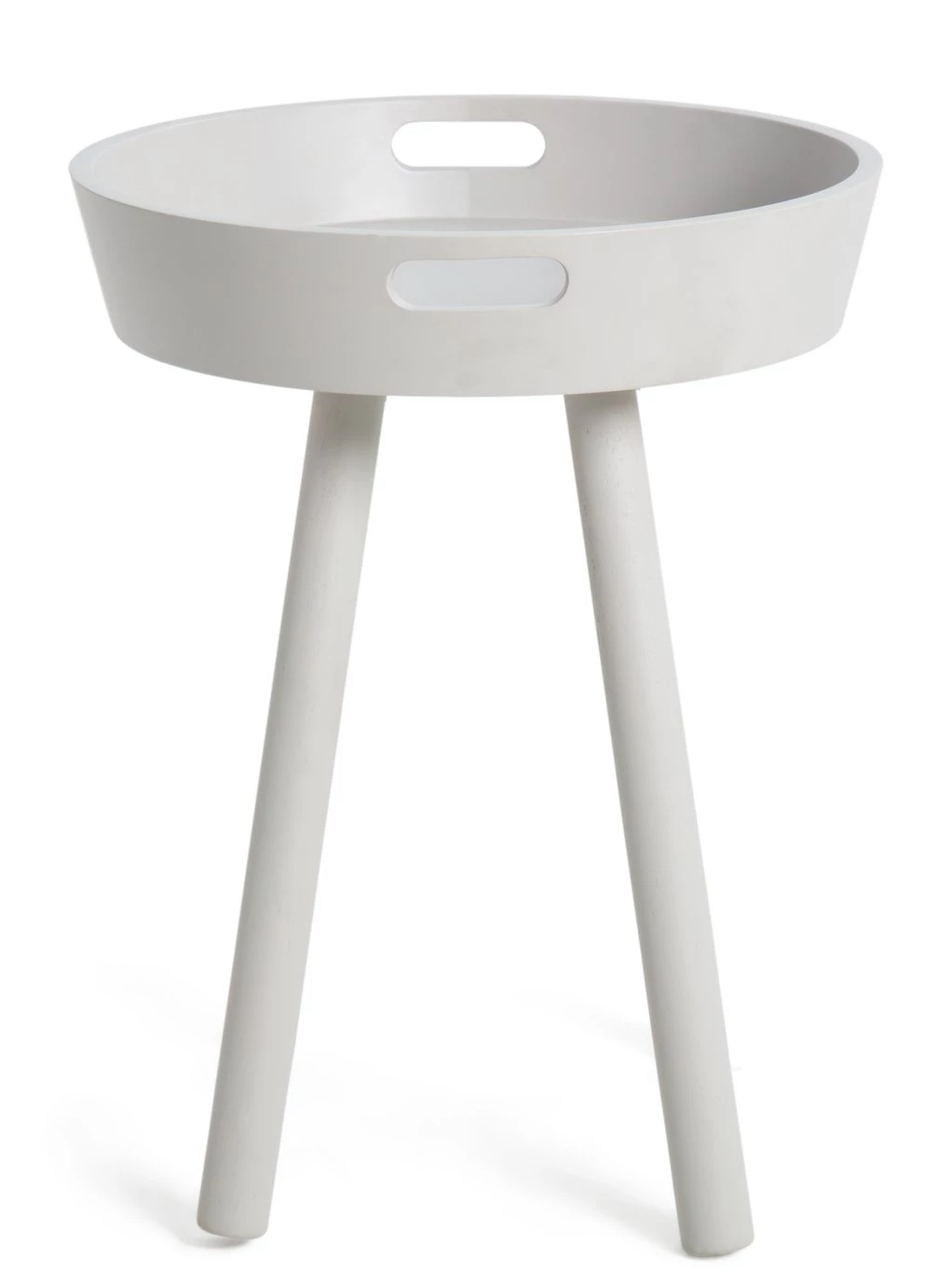 A side of style, please. Our sleek Rue Side Table is all about the minimalistic aesthetic. Finished in a high gloss cloud grey lacquer it features a round tray style top and splayed legs. Cut-out handles makes this versatile little table easy to move. A handy bit of furniture to have by an armchair or even next to your bed. Very smart, very useful.