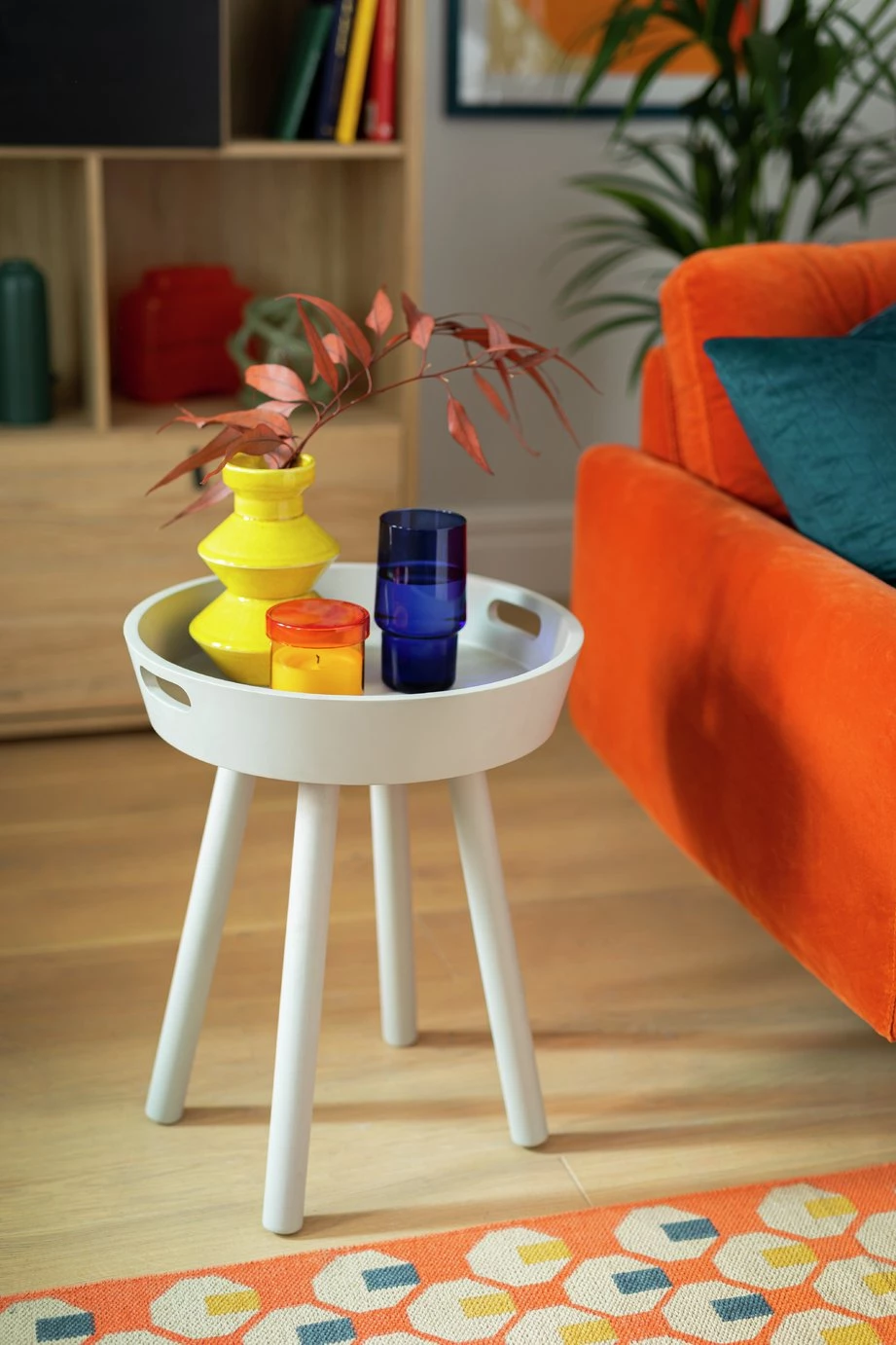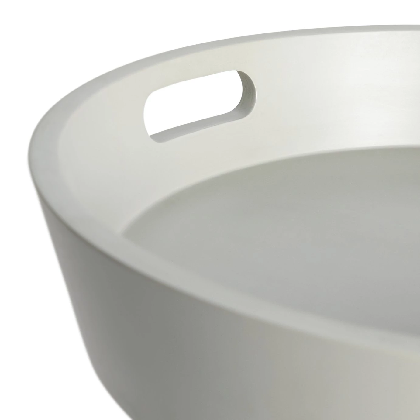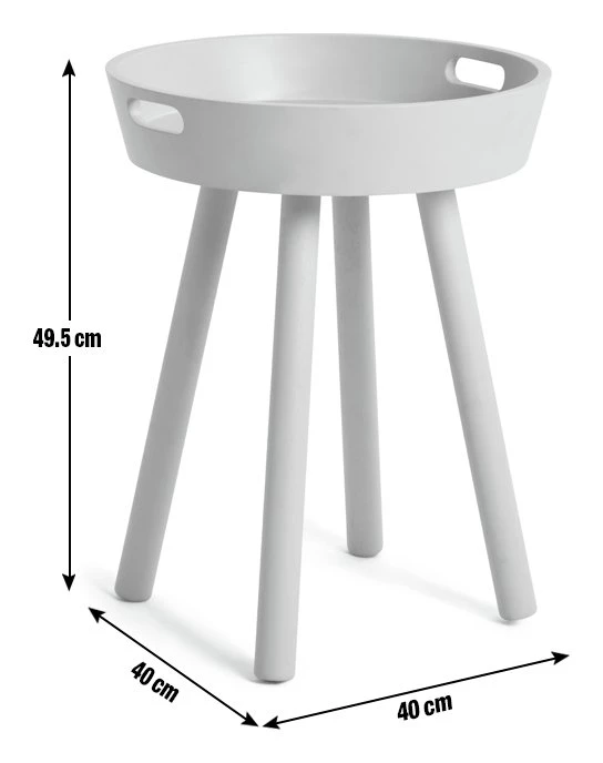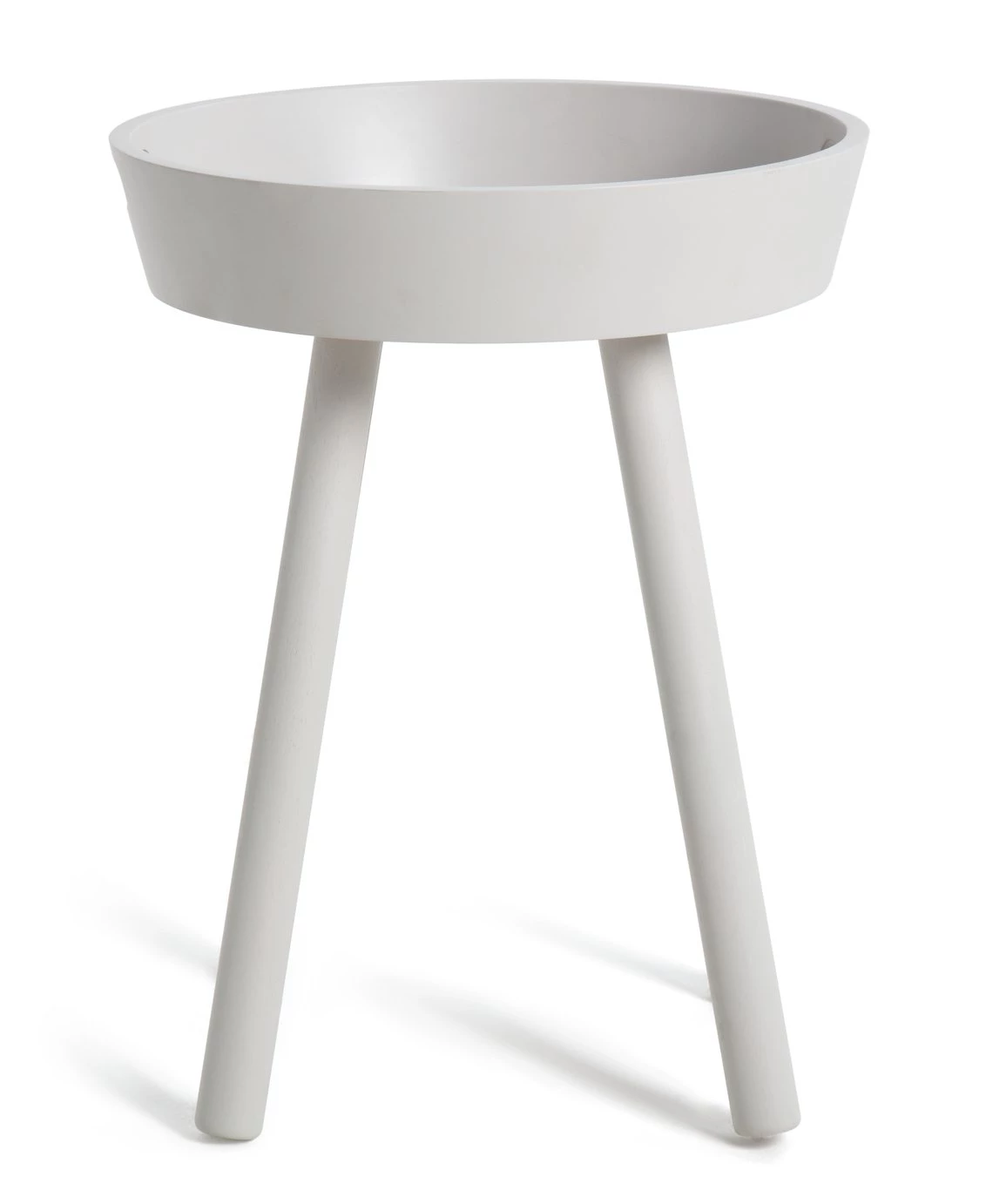 A side of style, please. Our sleek Rue Side Table is all about the minimalistic aesthetic. Finished in a high gloss cloud grey lacquer it features a round tray style top and splayed legs. Cut-out handles makes this versatile little table easy to move. A handy bit of furniture to have by an armchair or even next to your bed. Very smart, very useful.