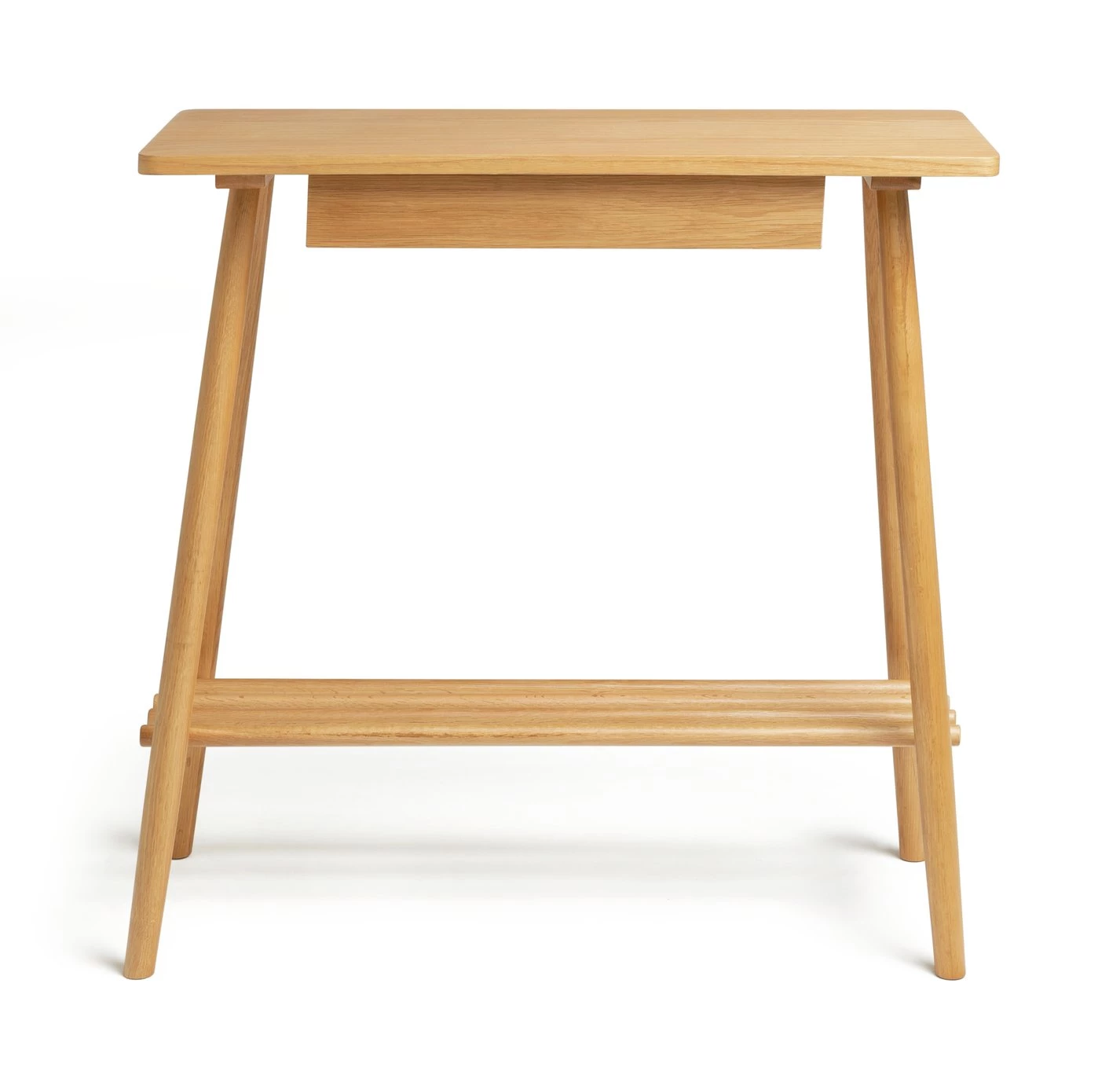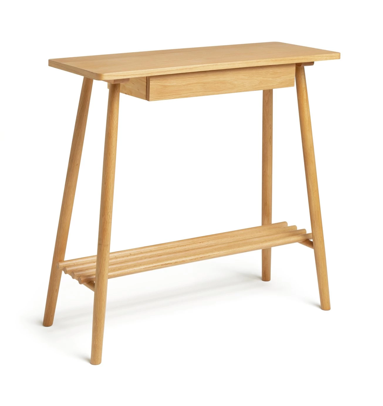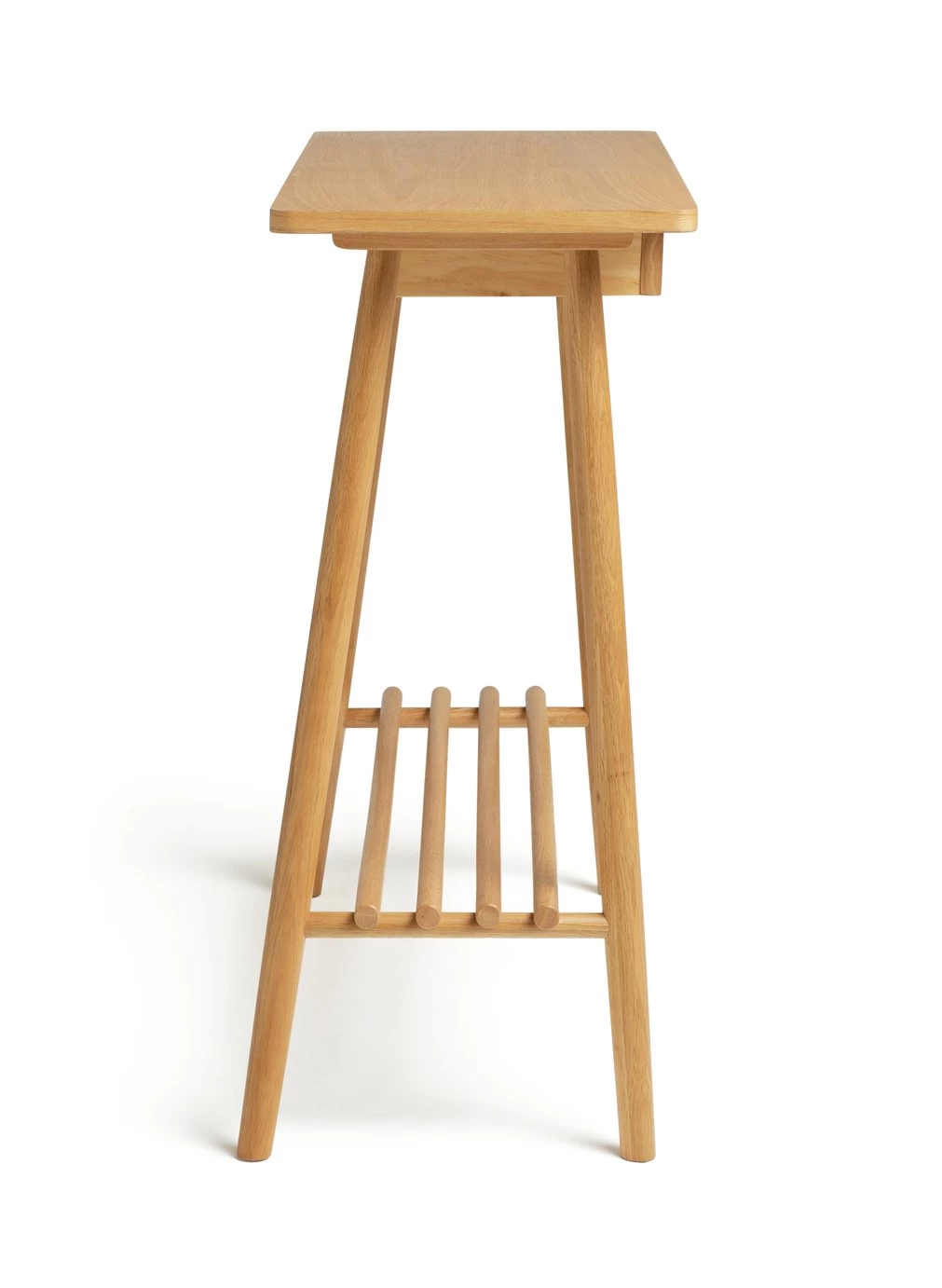 A warm welcome, Scandi style. This light oak console table ticks every Scandinavian chic box. Made from natural wood the clean lines are understated and elegant. The slim drawer and slatted undershelf adds uncluttered functionality. The pure design would look great in a hall. Pop a lamp on top. Stash your keys in the drawer. Keep boots on the shelf for going out and slippers for coming in. Would look just as stylish in your lounge or bedroom. It's furniture that says 'Welcome home'. Or valkommen hem, as they say in Sweden.