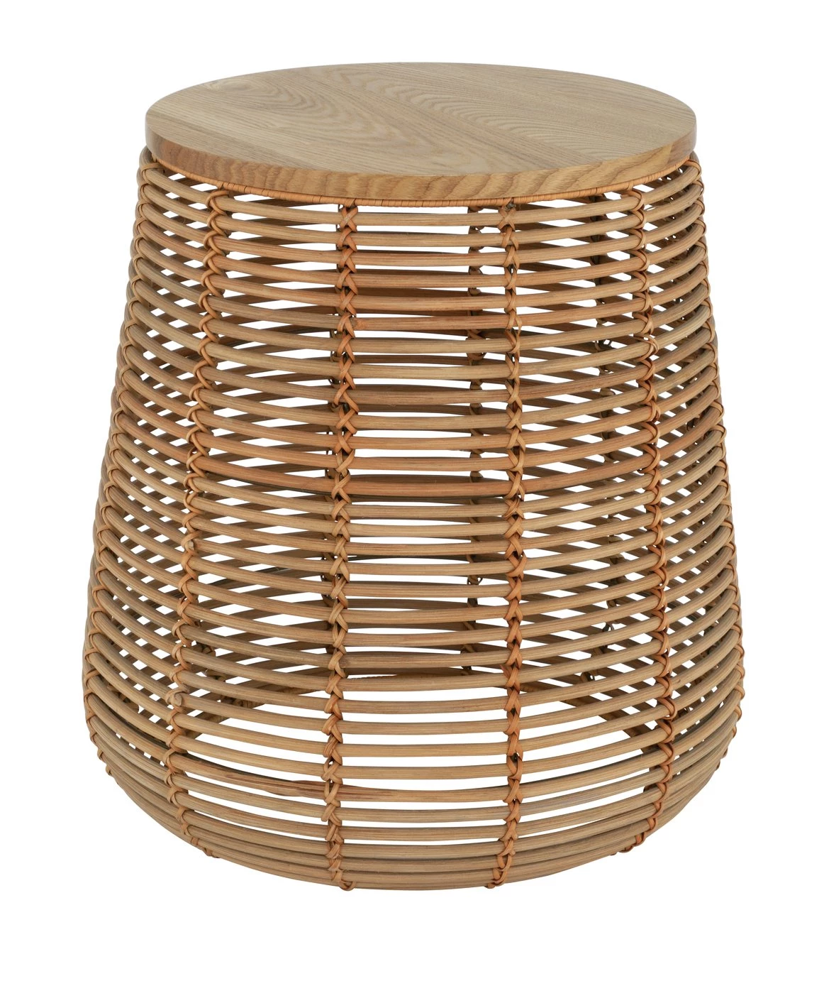 Bring a natural touch to your living area with the Hazel natural rattan side table. Handwoven in India, this side table is full of visual interest thanks to its striking mix of materials and textures. With a real rattan base and oak veneer top, Hazel will soon become the talking point of your home. Perfect for placing in a living room or conservatory, theres plenty of space for a table lamp and cups of tea, but remember to place down coasters to protect the surface from excess heat and scratches.