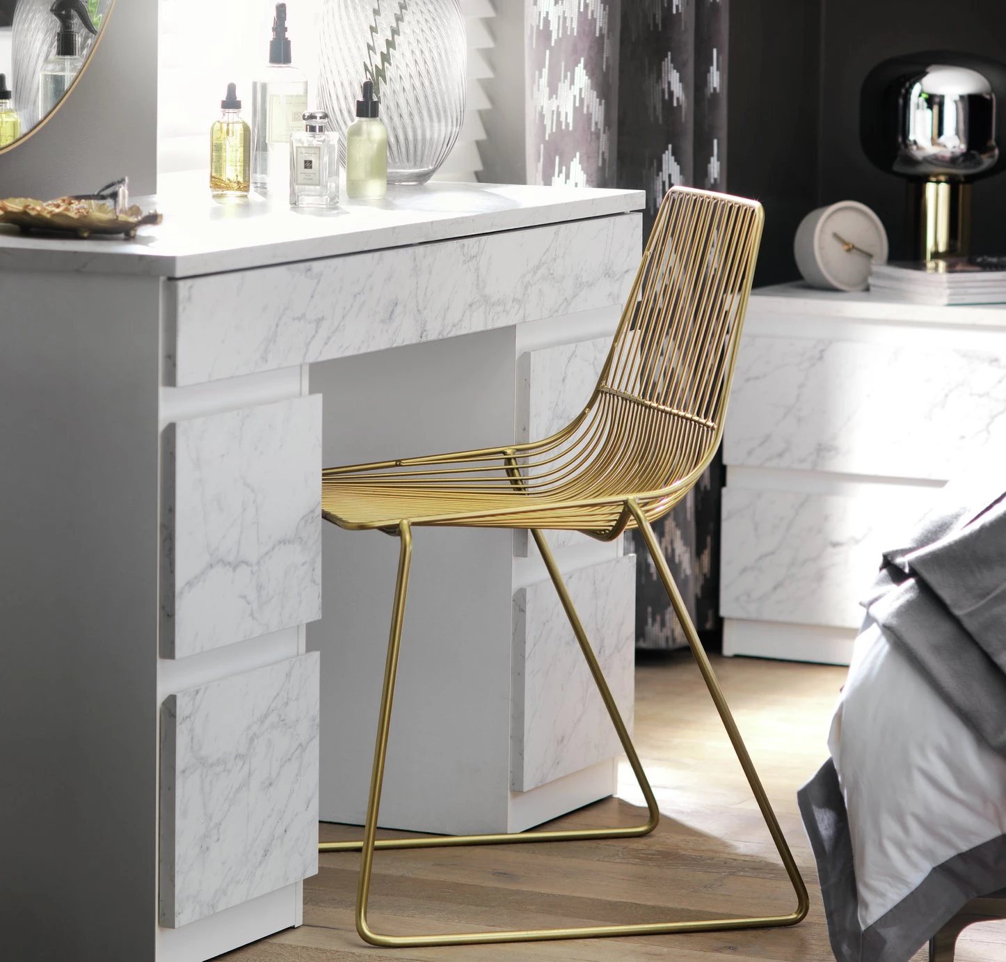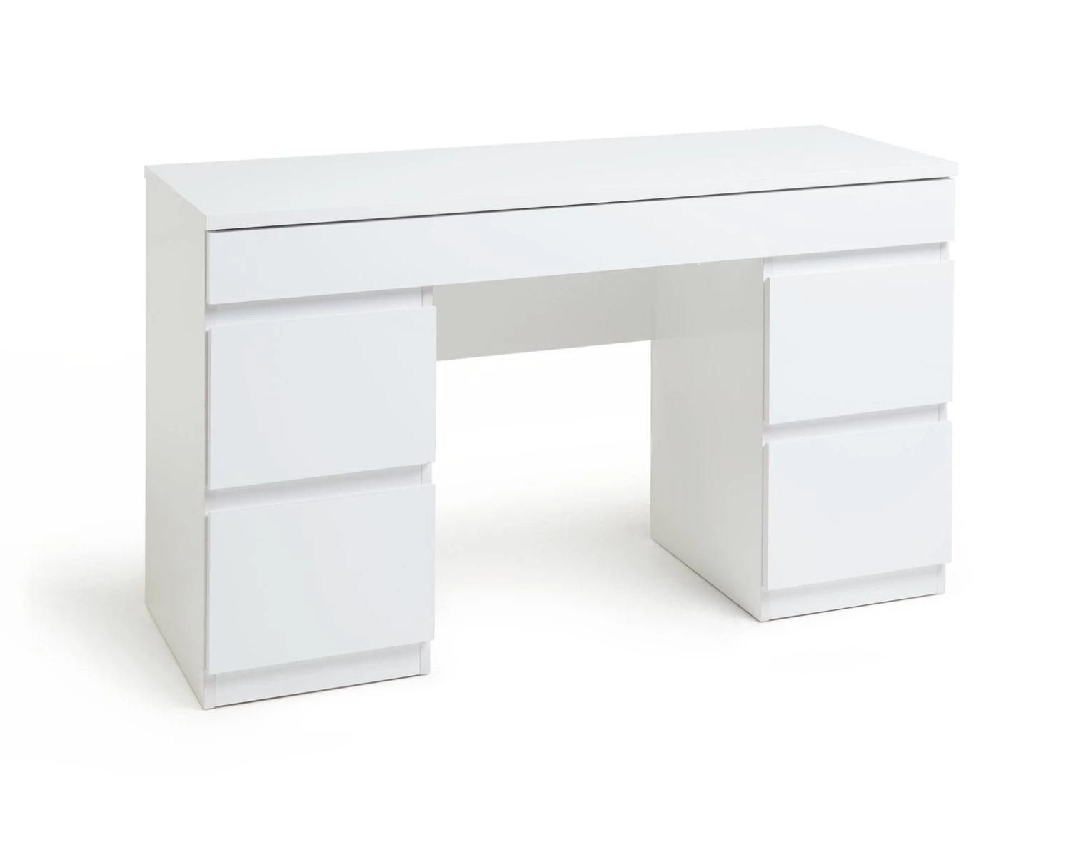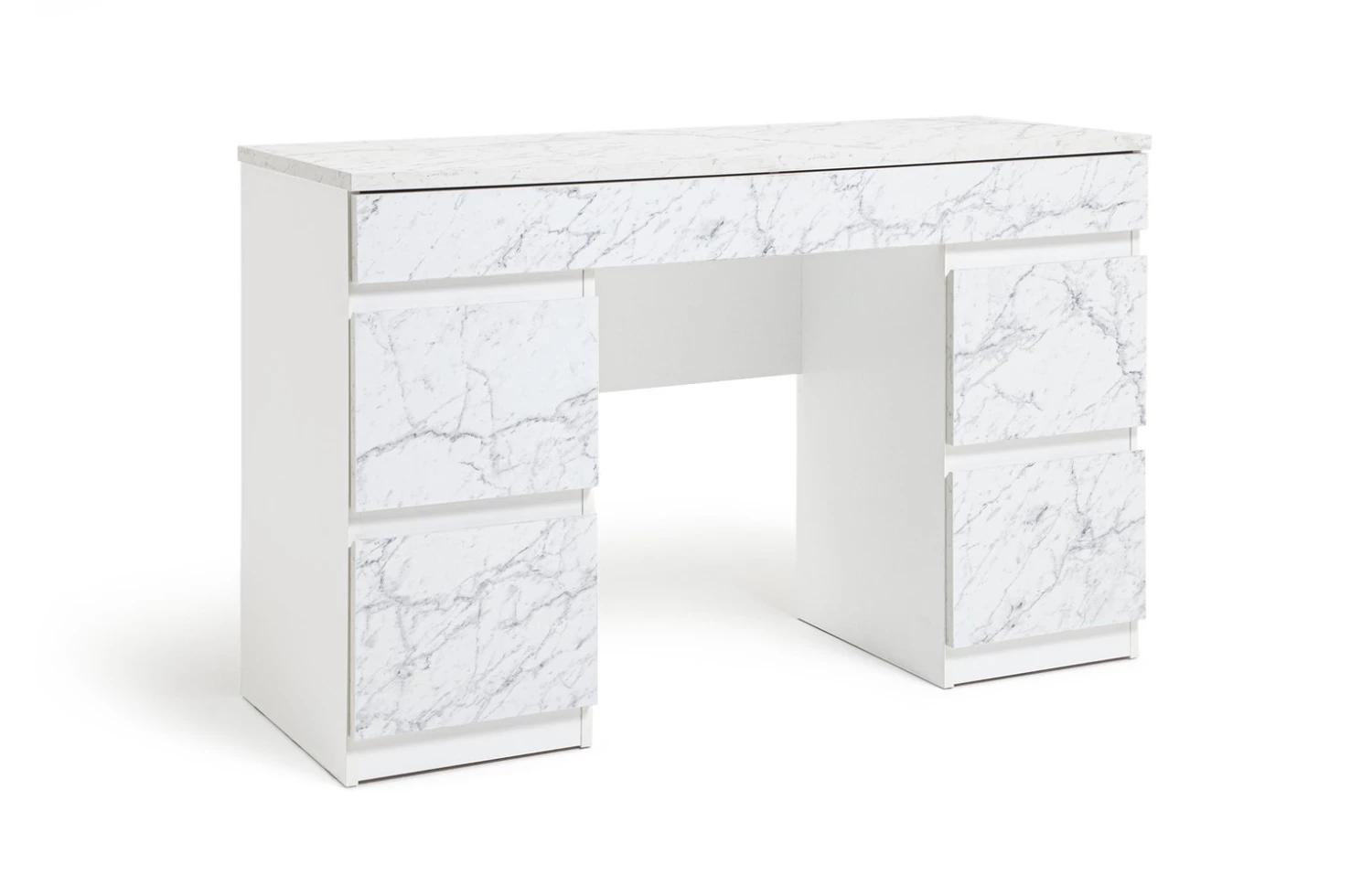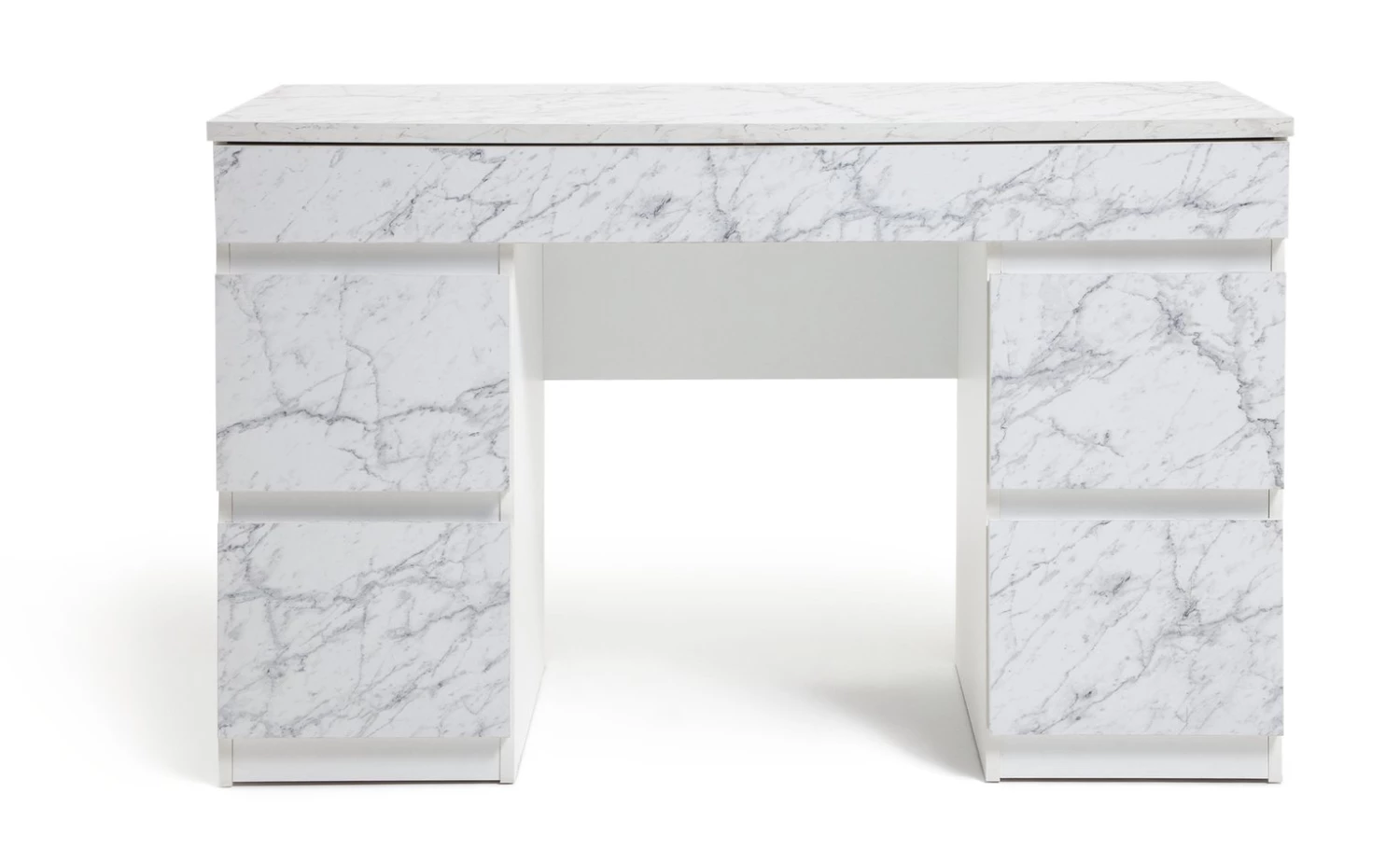 Spacious and streamlined with a luxe touch. Our Jenson dressing table provides plenty of space to keep make-up, hair products and other grooming essentials neatly out of sight. It has one full width top drawer and 4 deep side drawers, and all glide open easily on smooth metal runners. The contemporary handleless design is finished in a glamourous gloss marble effect. Top with a mirror, add a chic chair or stylish stool and you have a full-on dressing station. Smart.