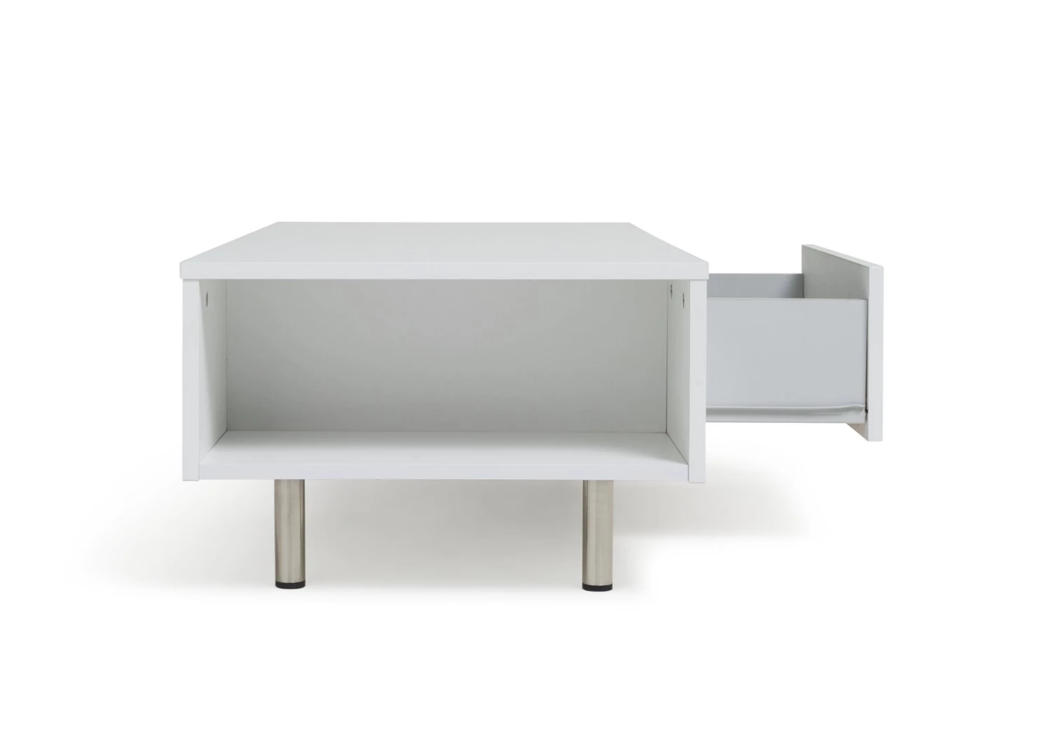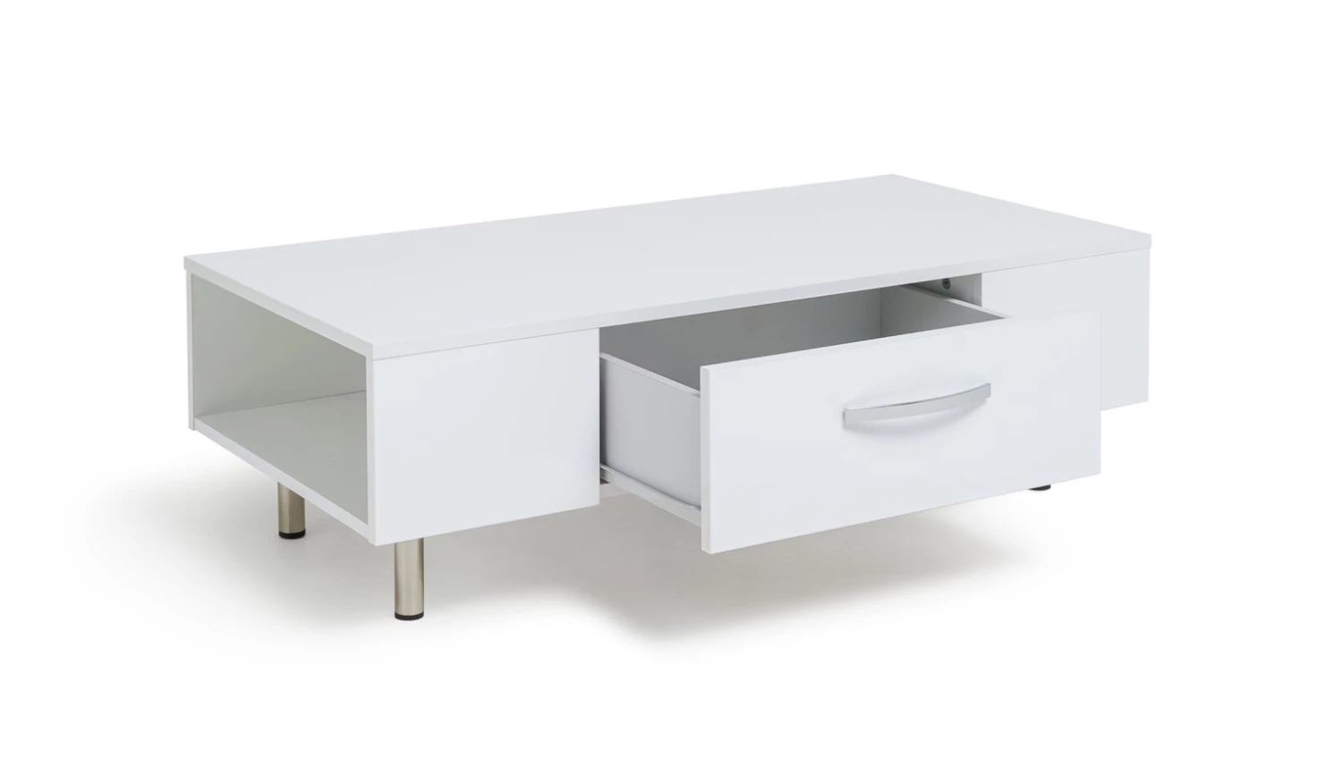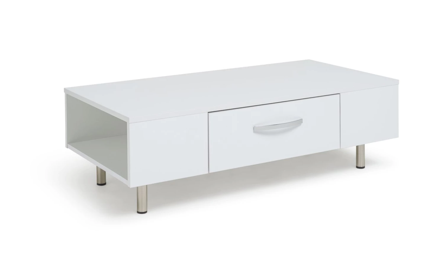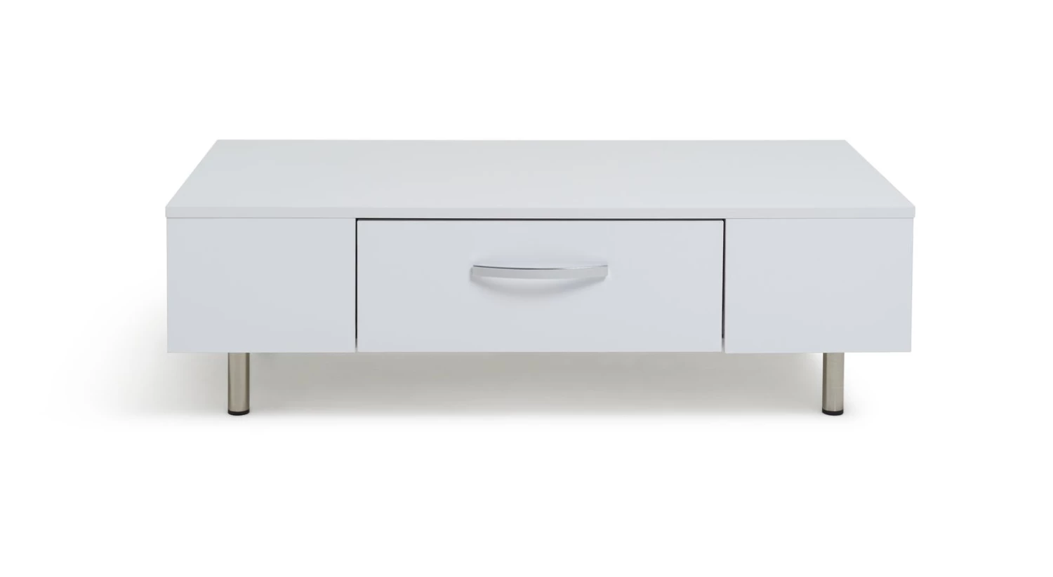 Sleek, smart and smooth. The Habitat Hayward collection's gloss finish makes it a fresh and fashionable choice. This coffee table lives to serve. It's easy-glide drawer is ideal for tucking remotes, magazines and coasters out of sight. Each end offers further open storage space for popping books and magazines on. The Hayward is stood from the ground on chrome feet and is finished with a modern chrome bow handle. Perfectly polished.