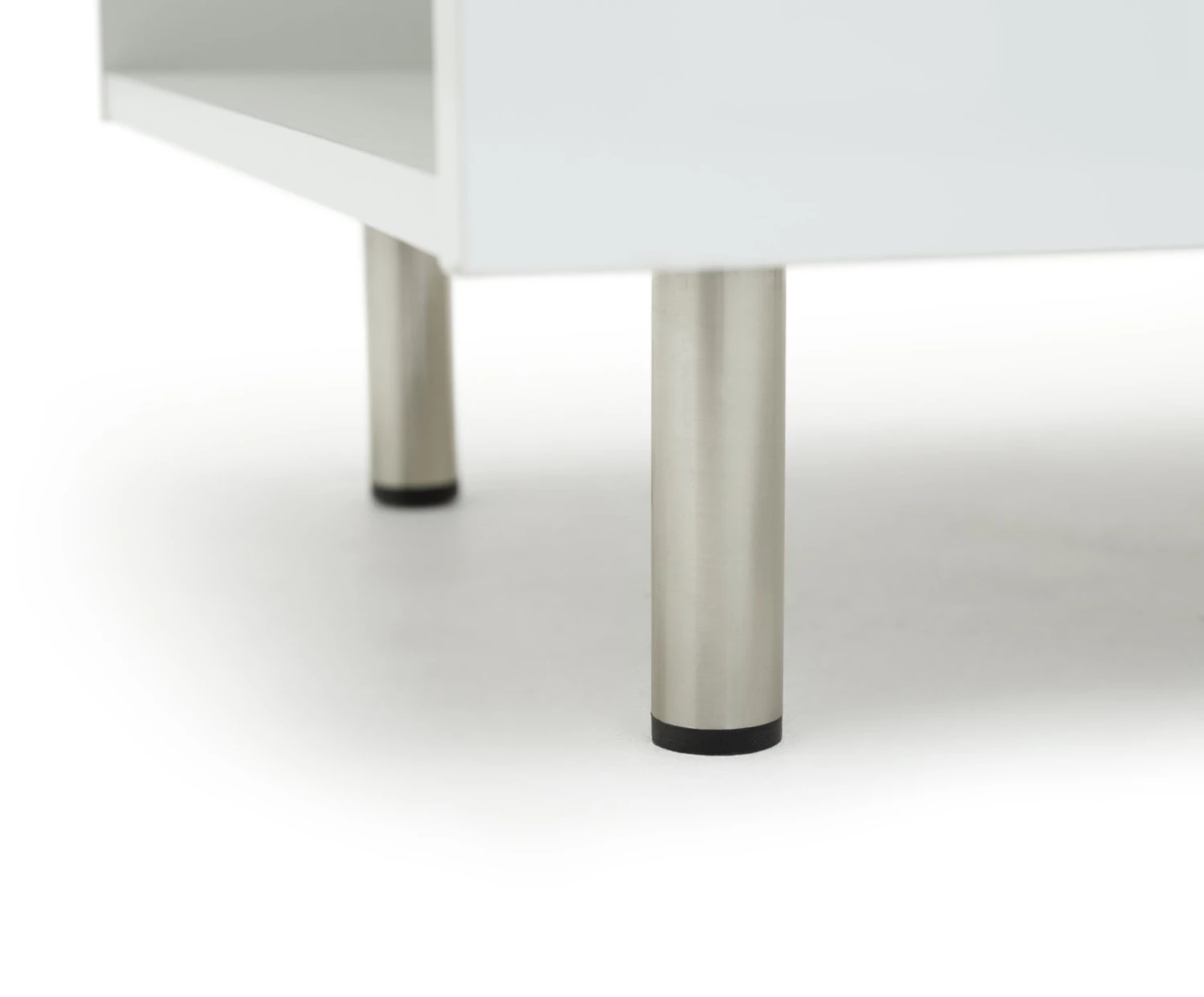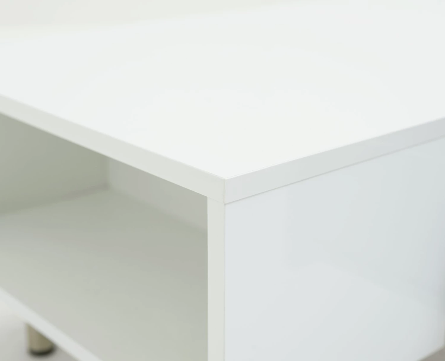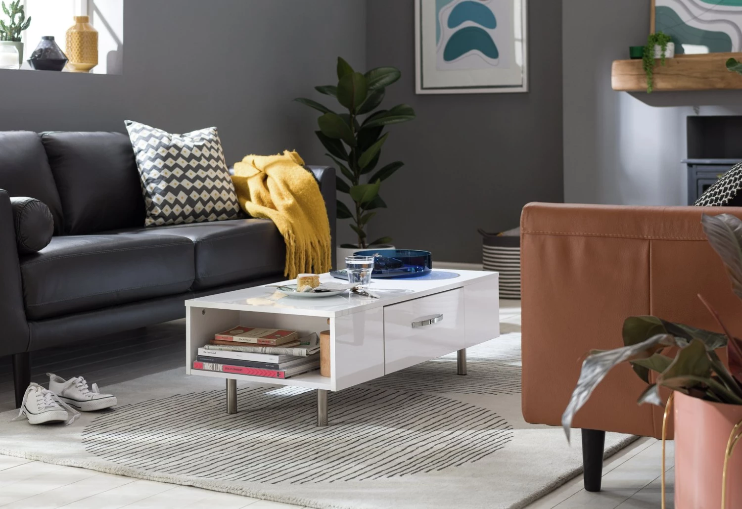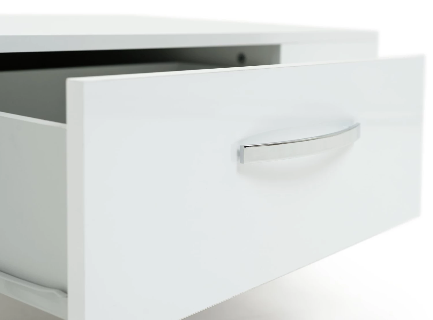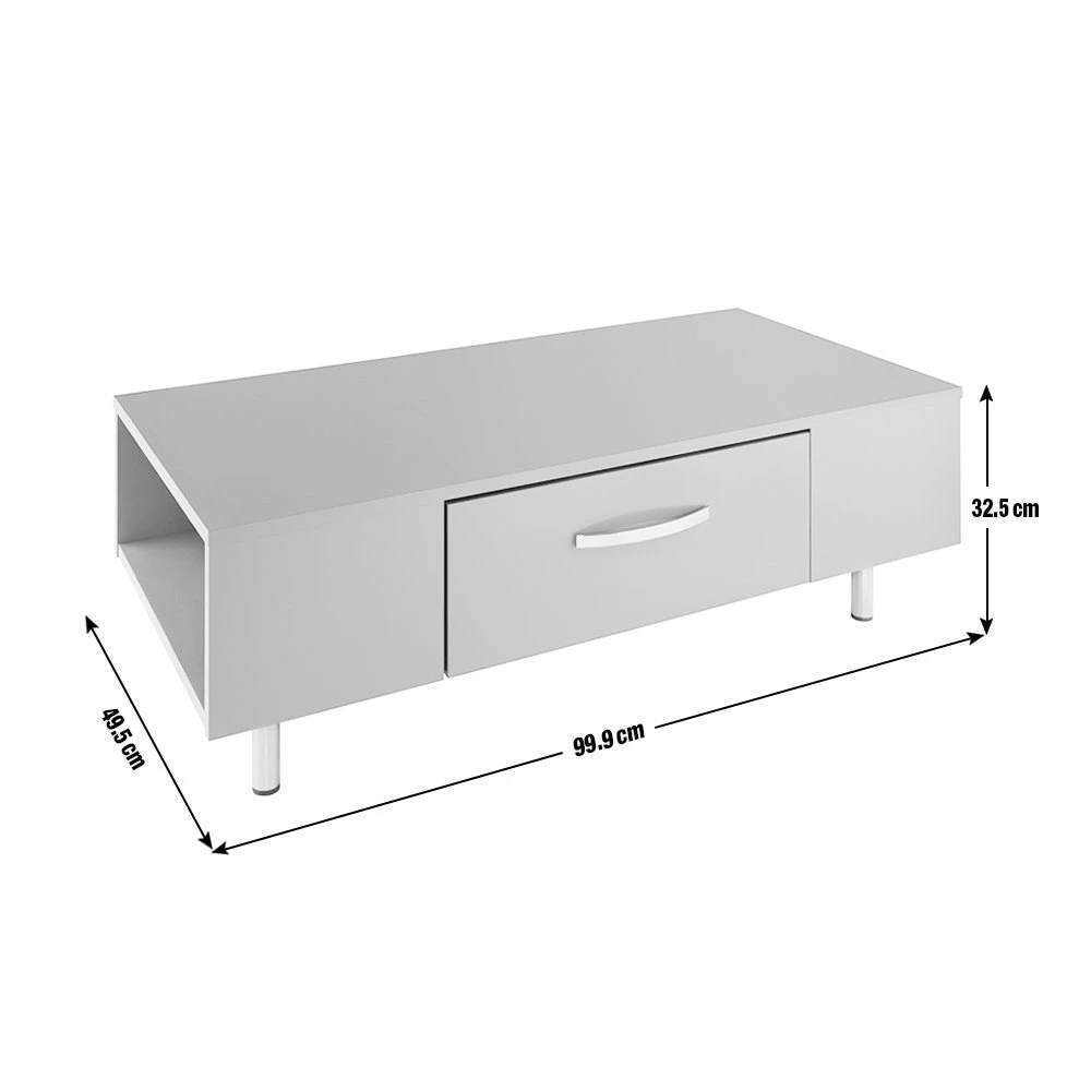 Sleek, smart and smooth. The Habitat Hayward collection's gloss finish makes it a fresh and fashionable choice. This coffee table lives to serve. It's easy-glide drawer is ideal for tucking remotes, magazines and coasters out of sight. Each end offers further open storage space for popping books and magazines on. The Hayward is stood from the ground on chrome feet and is finished with a modern chrome bow handle. Perfectly polished.
