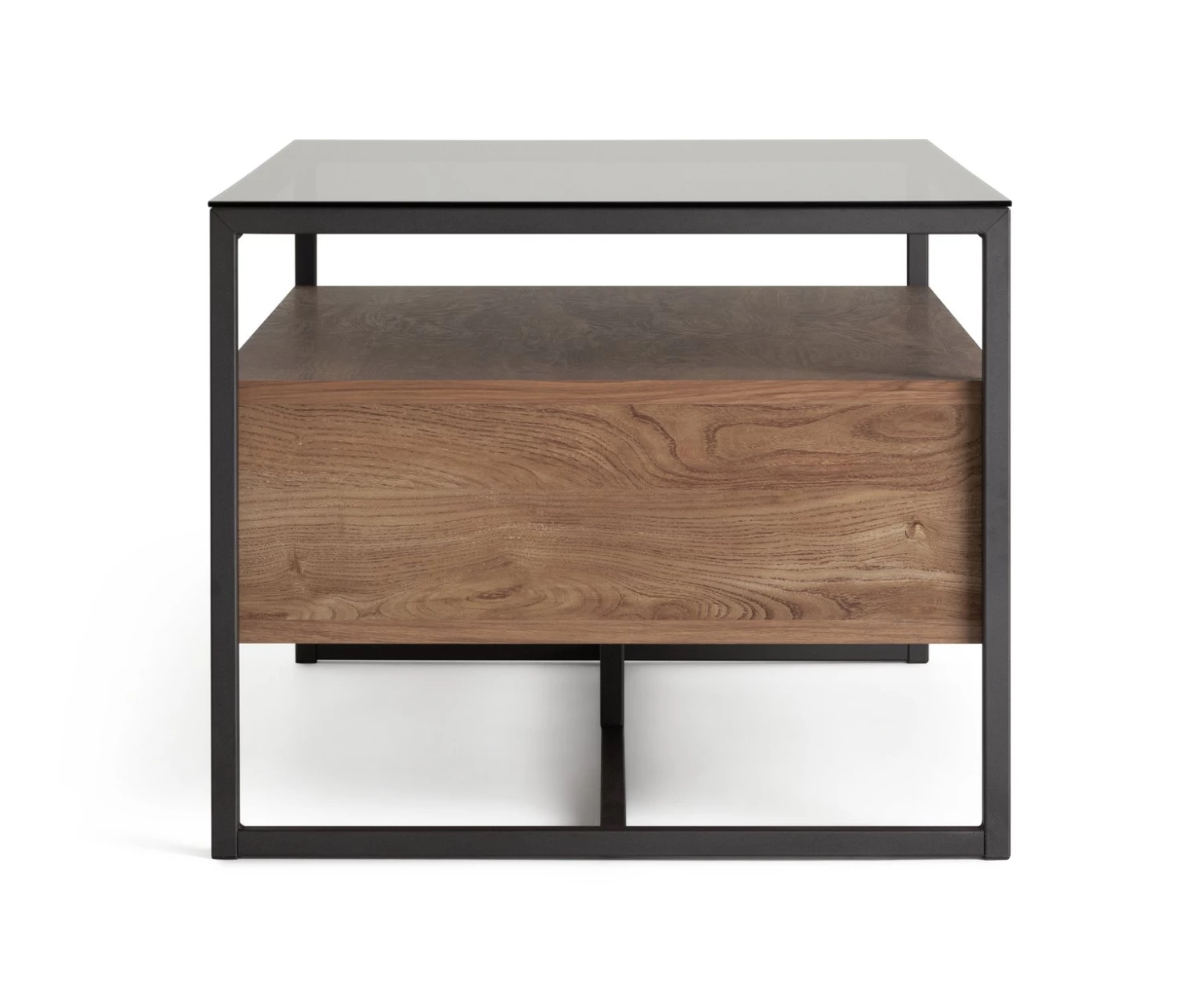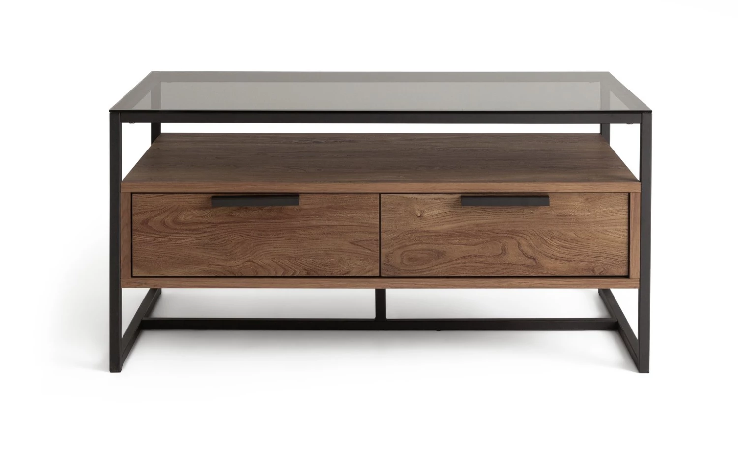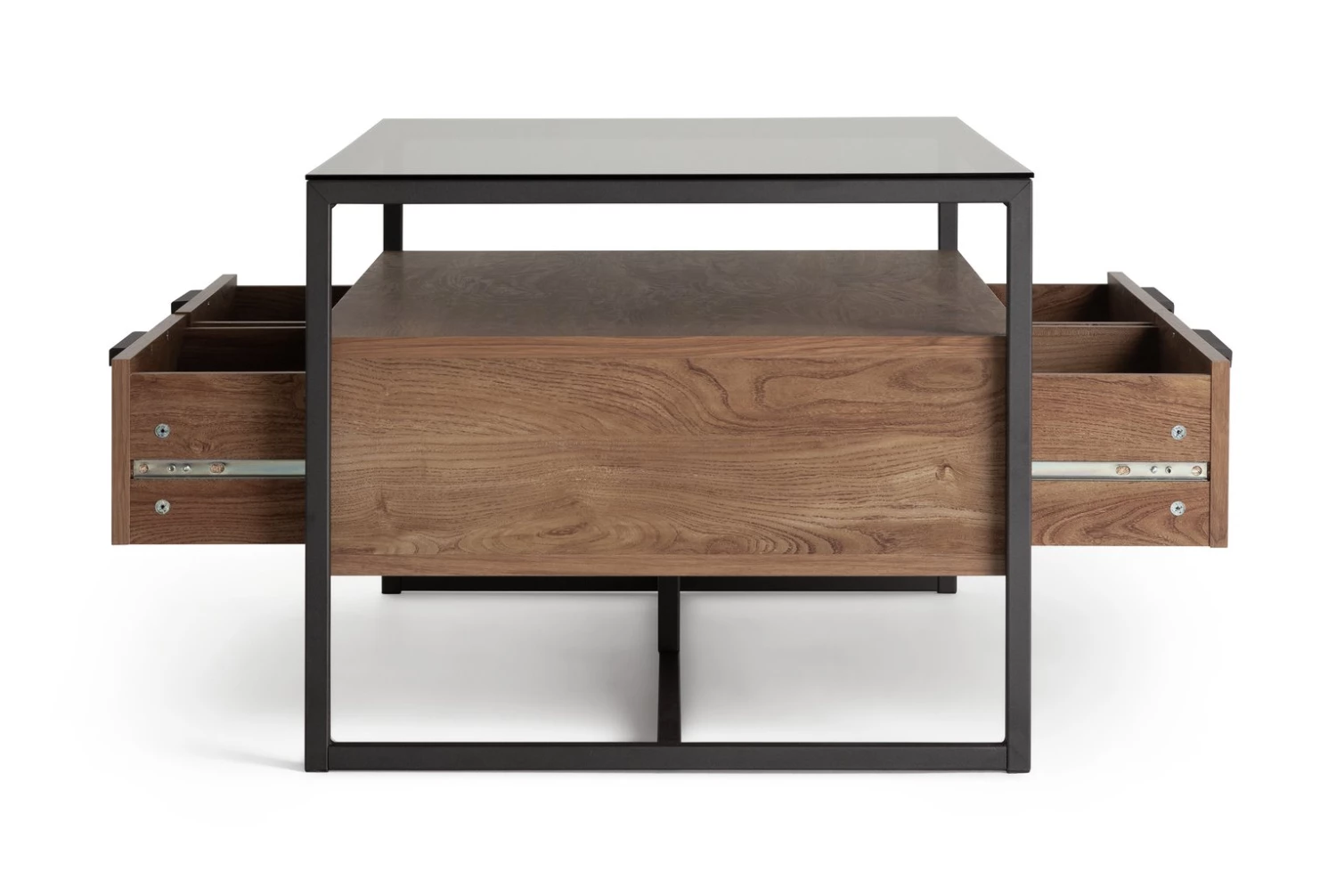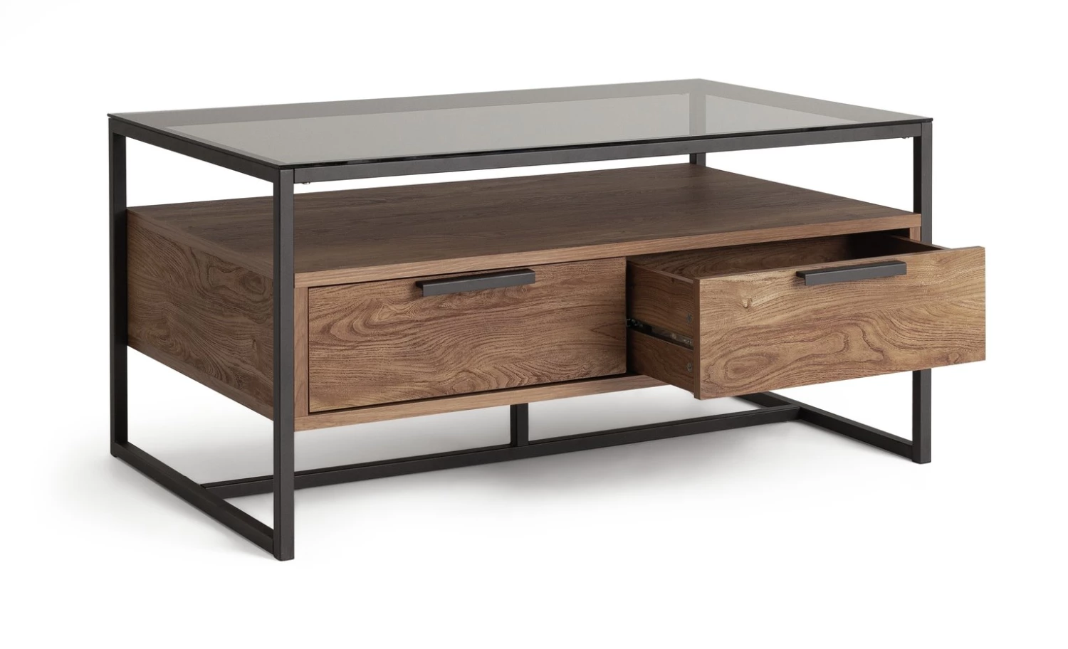 Tap into industrial chic. The Habitat Nomad coffee table's mix of metal framework and rich wood-effect finish stuns. Get your living space in order. There are 4 drawers iit looks great from any angle. It also gives you plenty of space to tuck lounge clutter away. The top is made from pristine glass to keep the design open and airy.