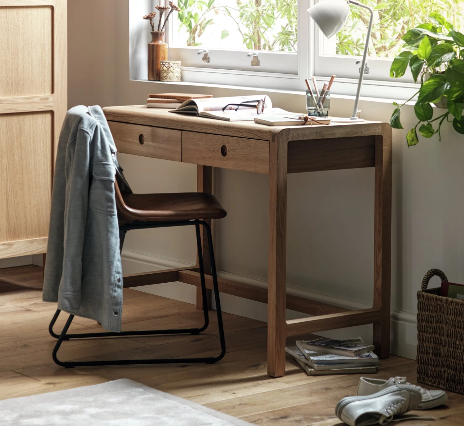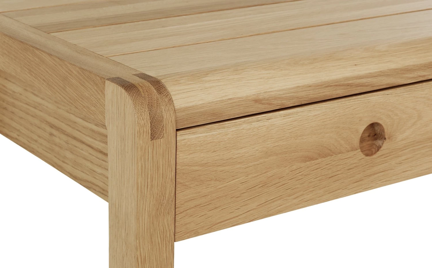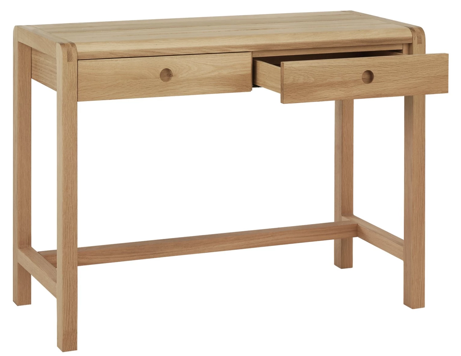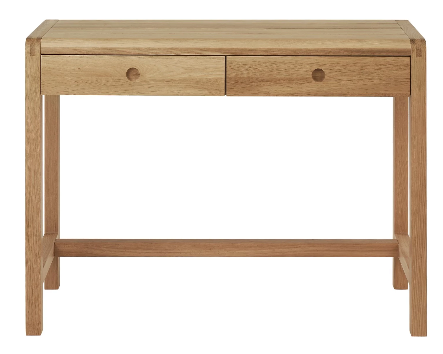 The understated and timeless Radius oak dressing table with 2 drawers is beautifully crafted from lacquered solid oak and oak veneer.